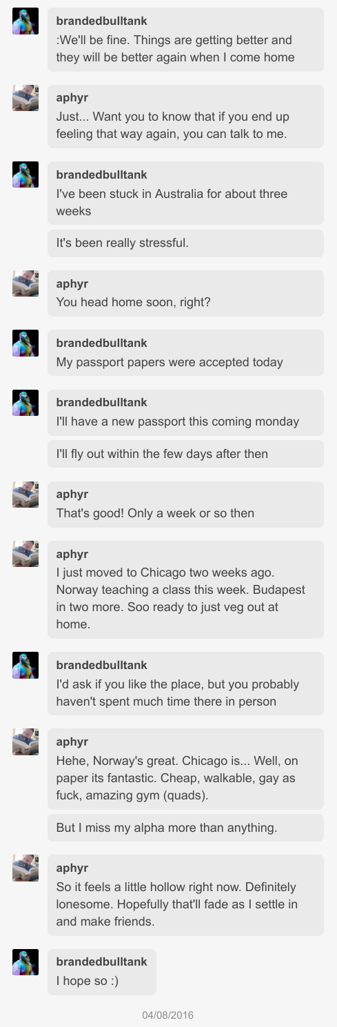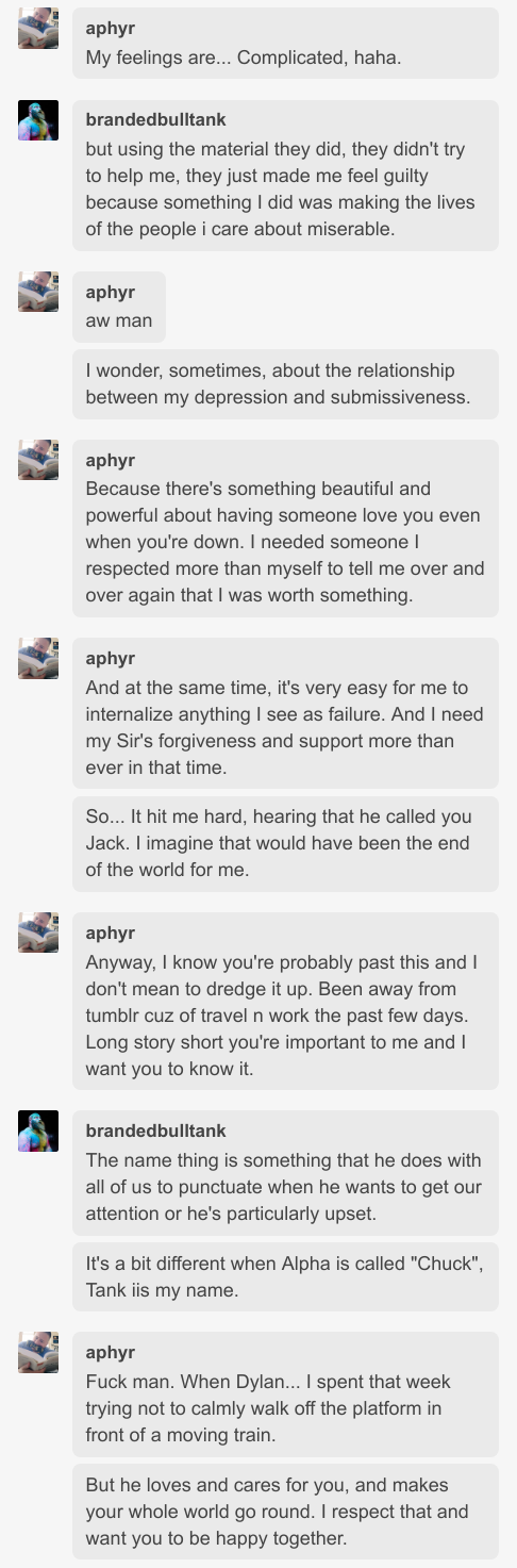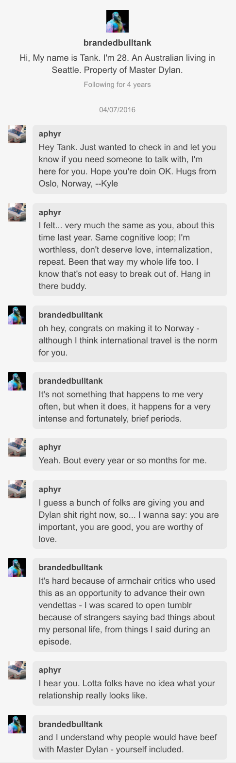 When I knew Jack, he was Tank Chapman; later, he took Dylan’s (@noodlesandbeef’s) last name, becoming Tank Hafertepen. The name Tank was important to him, and something that he expressed joy and pride in–but it was also a marker of Dylan’s control and erasure of his identity. This is a complicated matter, because Jack eroticized a lack of control, but one of his closest friends told me that he expressed a desire to change his name back to Jack. That’s what I’ll call him here.