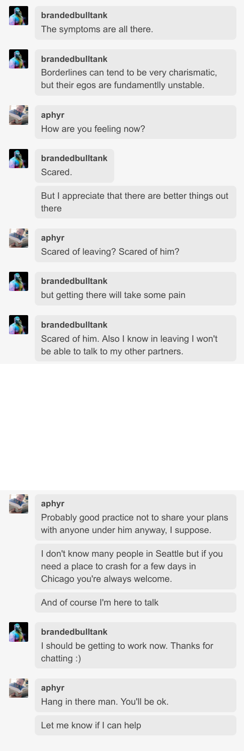 Because of this ambiguity, it took years for me to decide that Jack’s relationship with Dylan was abusive. Finally, Jack told me he was being abused; that he was scared, that he needed to escape. He told other friends he was being abused. And while much of Dylan’s manipulation remained subtle and ambiguous, he took concrete actions which cannot, I feel, be interpreted as a part of a healthy Dom/sub relationship: he isolated Jack from his friends, and used legal and financial threats to reassert control when Jack tried to leave.