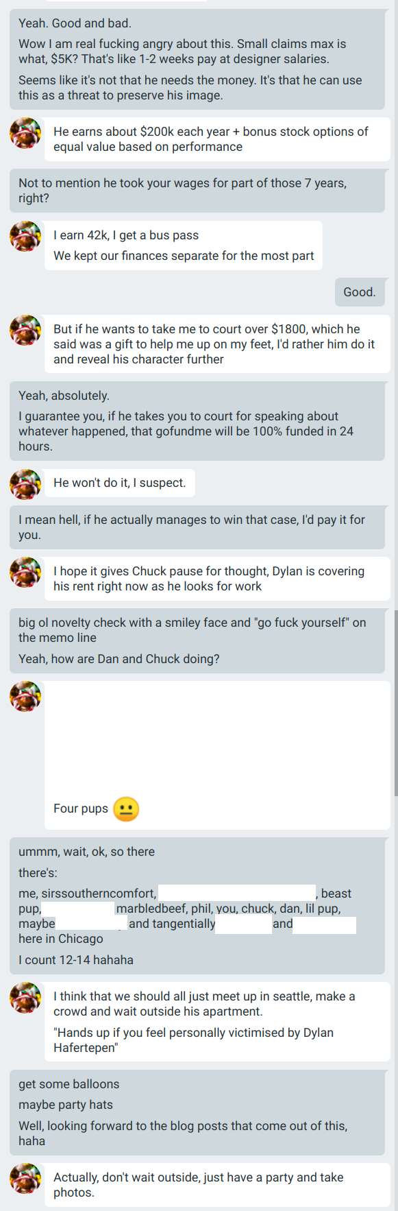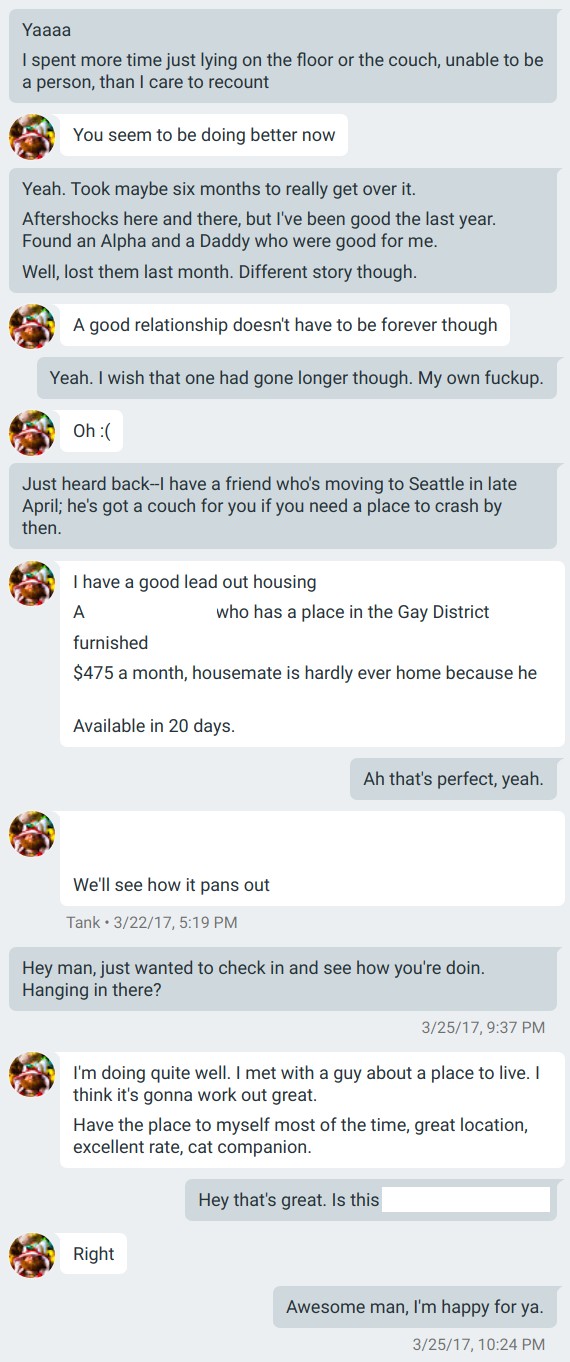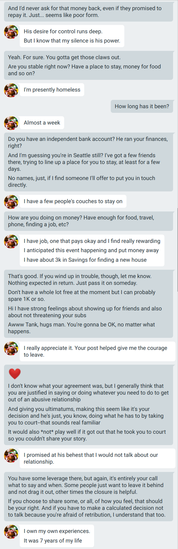 In March of 2017, Jack left the relationship. Dylan threatened Jack with small claims court if he talked about the relationship. Jack told me that Dylan had covered his rent as a gift, and that gift unexpectedly became a loan when he left. The $4700 Dylan sought, roughly 1.5% of Dylan’s annual income, would have completely wiped out Jack’s escape fund.