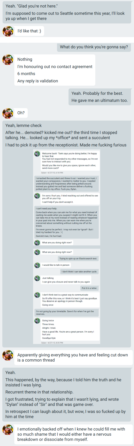 Dylan’s been something of an open secret in the SF and Seattle leather communities for years now, but we’re a fractious lot, and the whisper network is slow, incomplete, and often vague. That’s part of why I’m publishing these conversations with Jack now: to provide a specific point of reference for people the whisper network doesn’t reach.