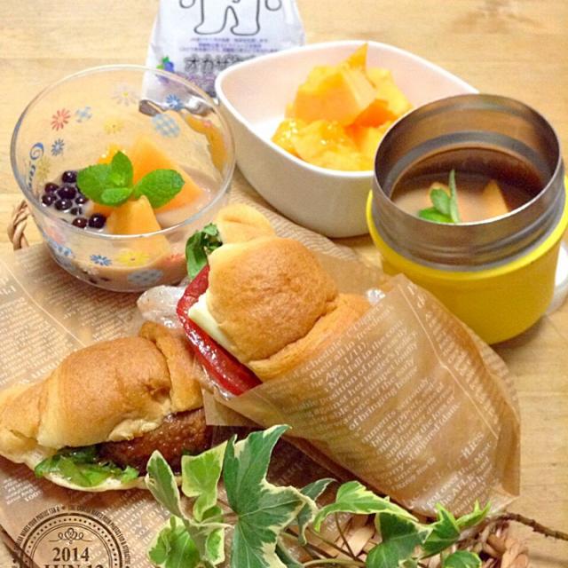 SnapDishに投稿されたかずさんの料理「中学生弁当 (ID:fbmWra)」です。「2014 06 12の中学生弁当 クロワッサンサンド二種ハンバーグ野菜とチーズ ブラックタピオカメロンミルクティー今日は午後から芸術鑑賞とやらで この雨の中午後から校外へ行くようです 保護者にもお誘いの手紙が来ていましたが 高校生の学校公開と重なり断念 さっ ワタクシはしっかりガン見して 監視の目を光らせて 来ますよぉ」弁当 中学生 中学生弁当