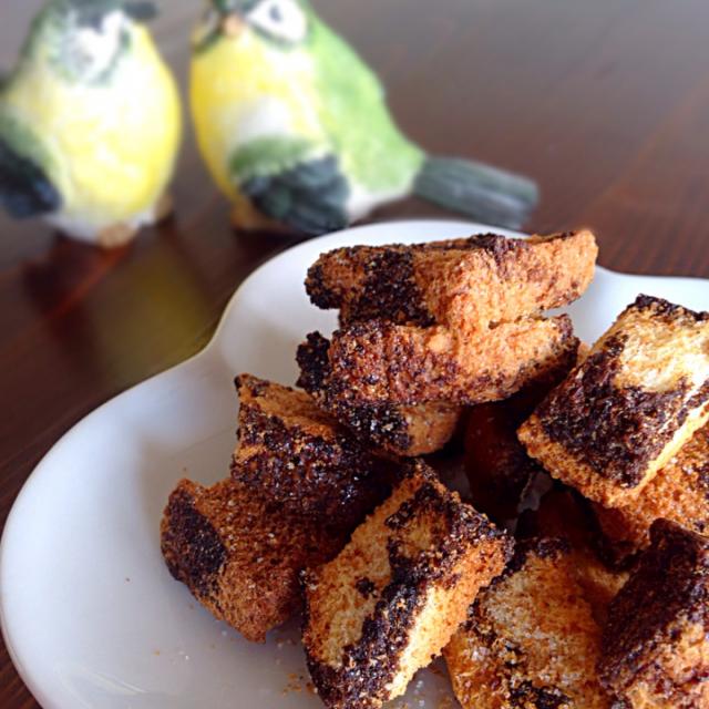 SnapDishに投稿されたいのちゃんさんの料理「ほろ苦Coffeeラスク (ID:fqHbua)」です。「フレンチトーストの耳をラスクに 濃い目のほろ苦Coffee味が美味しくてクセになる よーく焼いてるのでざっくざく 焼きあがってからシナモンシュガーをまぶしました 京都の聖護院さんでカネールというお菓子があってその味をヒントに 食べ友はおうちに小鳥がいるれいちゃんお願いしたいよ」ラスク ◡ *❤