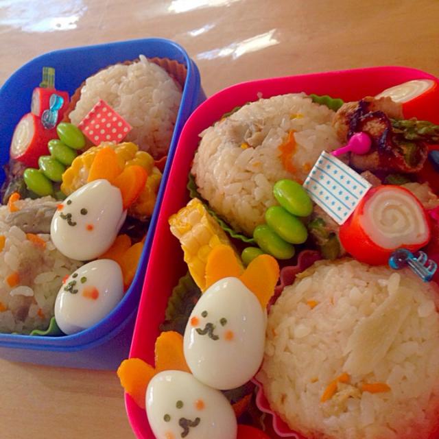 SnapDishに投稿されたちかこさんの料理「五目ご飯弁当 (ID:Krq4Sa)」です。「アスパラ豚巻きぐるぐるチーズ枝豆ピーマンおかか炒めうずらのうさぎちゃん」五目ご飯弁当 五目 ご飯