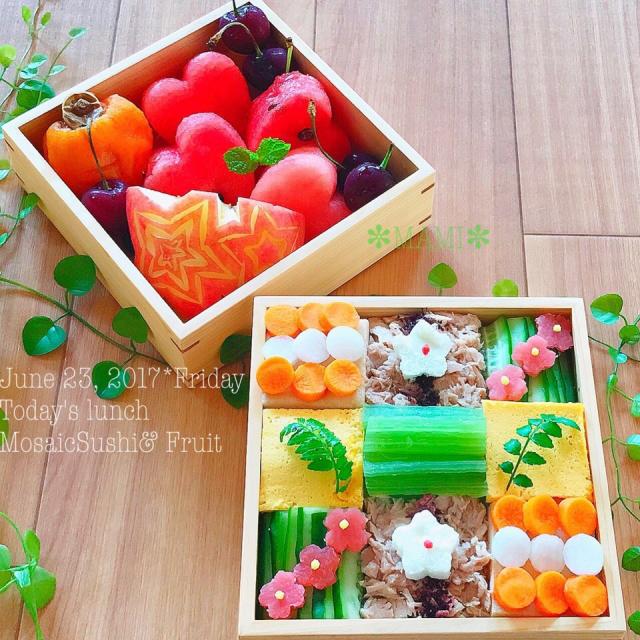 SnapDishに投稿されたmamiさんの料理「2017 6 23 モザイク寿司 フルーツ弁当 お弁当 おひるごはん ちらし寿司の日 フルーツ (ID:f1iefa)」です。「おはようございます 一週間ラストになりました2017 06 23 モザイク寿司 フルーツ弁当 ちらし寿司 酢を強くきかせてます の上に糠漬け胡瓜 人参と大根ピクルス シーチキンゆかり添え 花型に切った白身卵焼き 花型しば漬け 蕗と高野豆腐の和風出汁煮 スイカ リンゴ アメリカンチェリー 干し柿です コメント返信遅れてますが必ず致しますありがとうございます」寿司 ちらし寿司 フルーツ
